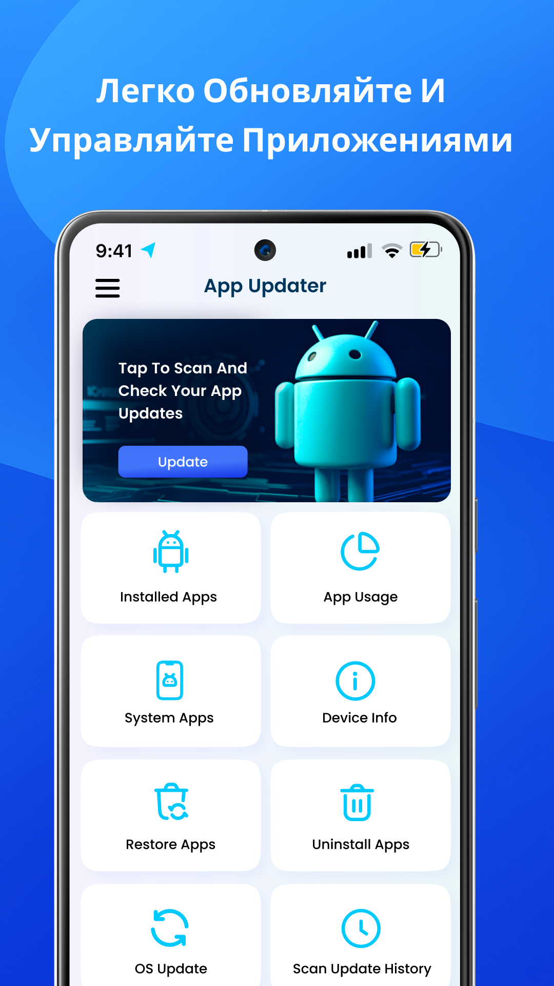 Приложение позволит вам поддерживать ваш телефон в актуальном состоянии. Приложение будет сканировать Google Play, ища доступные обновления. Обновления игр, обновления приложений на Андроид, обновление самого ПО будет вам доступно в любое время. Есть востребованная опция – просмотр установленных приложений, в том числе и системных.